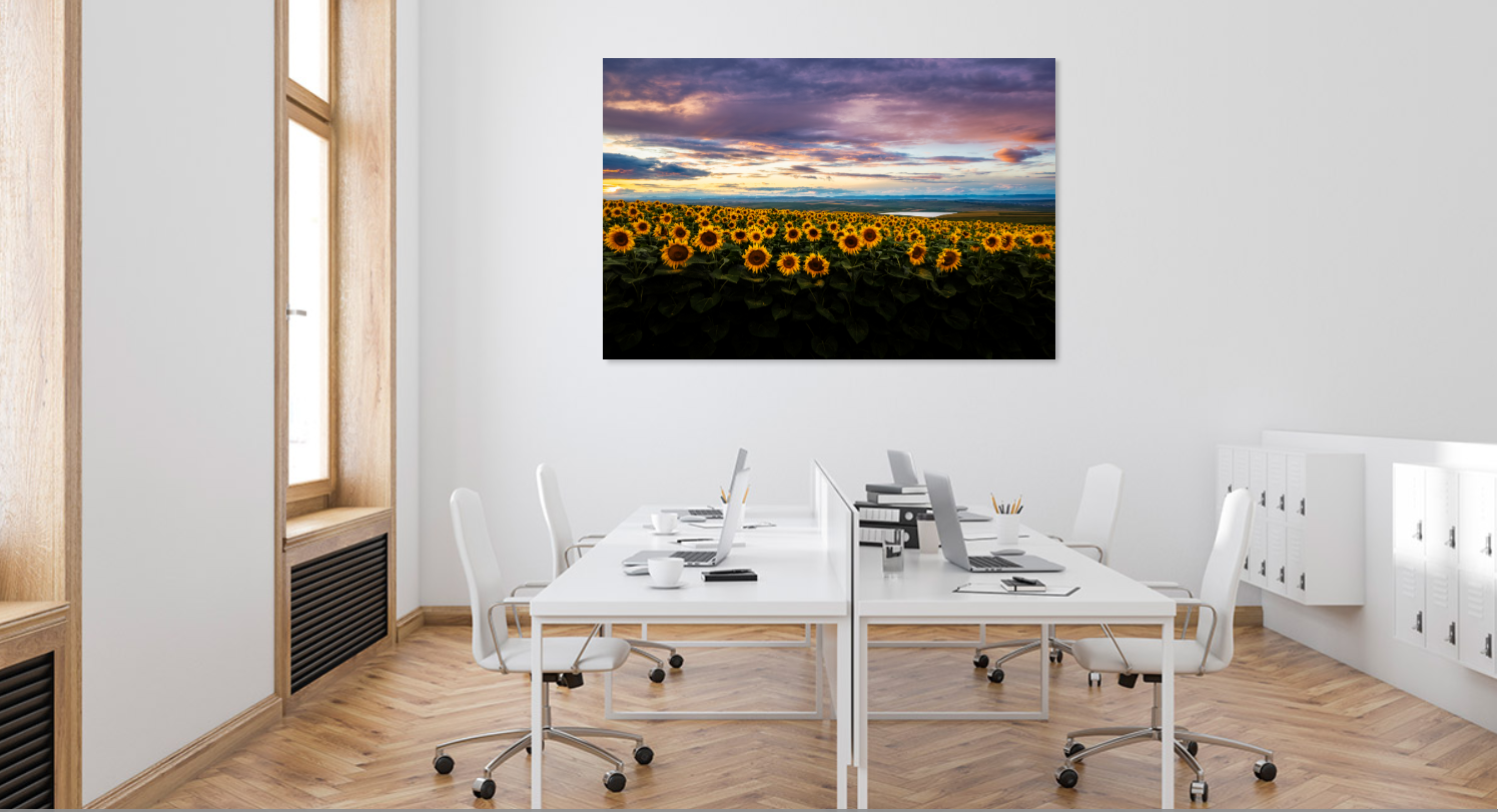 Tablou canvas, Floarea soarelui, peisaj, sunflowers in the sunset, 120x80 cm