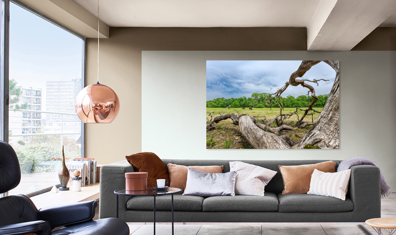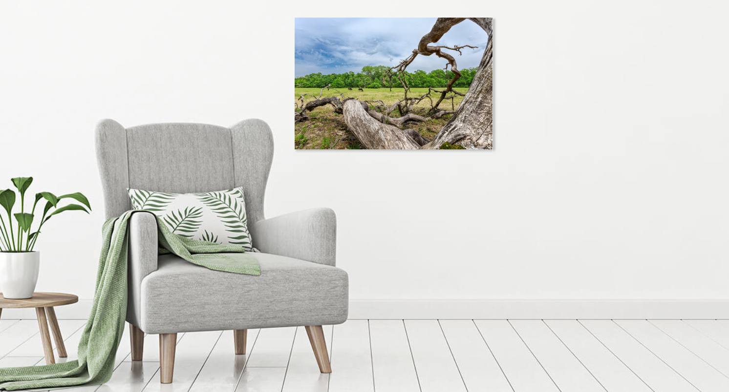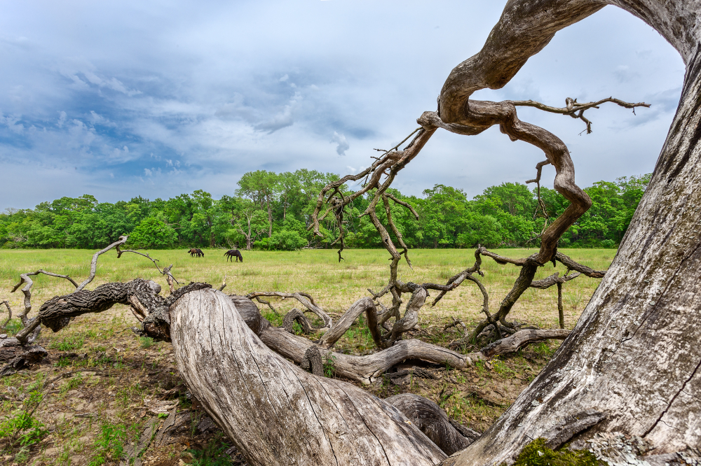 Imaginea surprinsa de fotograf reprezinta natura de pe Grindul Letea, din Delta Dunarii, in toata spendoarea sa: un imens stejar cazut, cai salbatici in fundal si hasmacuri cu vegetatie arboricola.