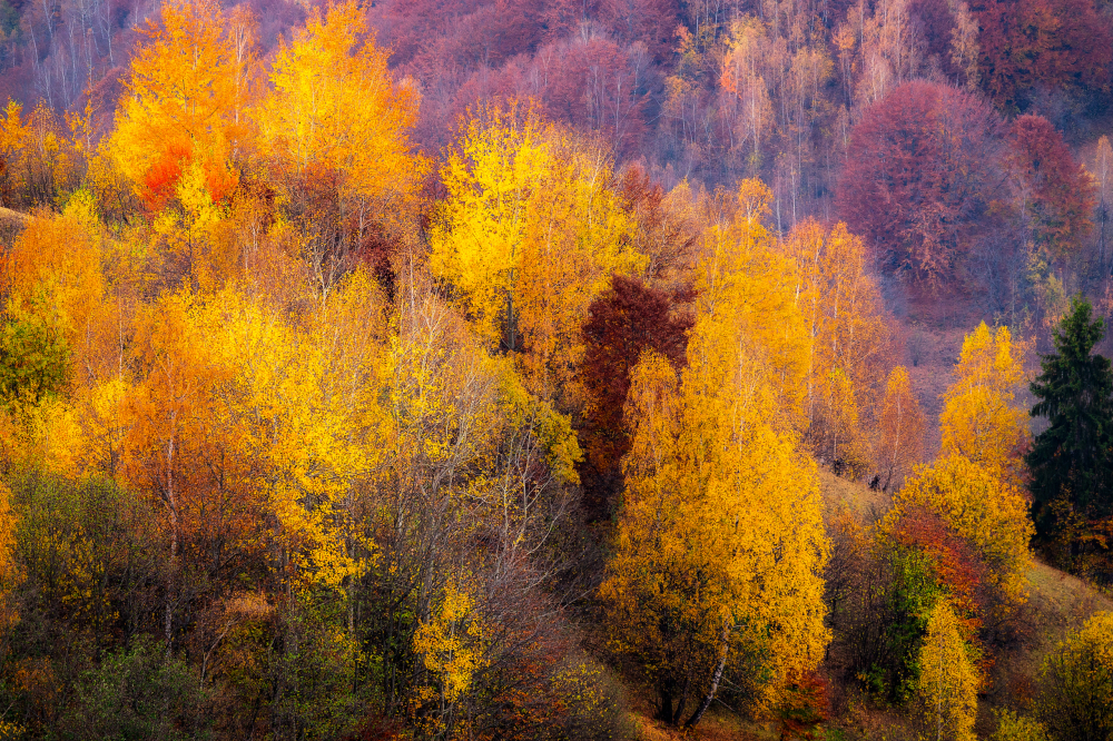Imaginea realizata de fotograf surprinde culorile toamnei pe Culoarul Rucar-Bran, Muntii Bucegi.