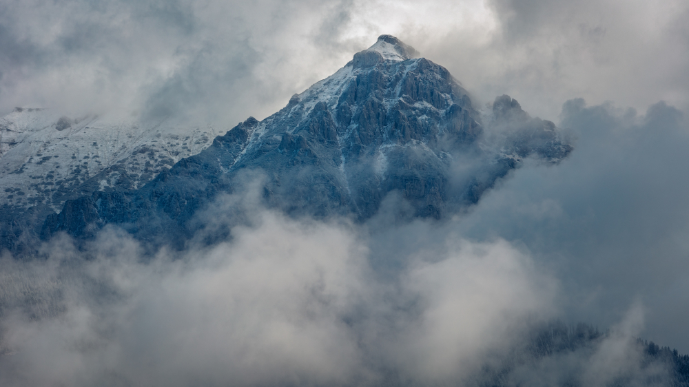 Imaginea realizata de fotograf surprinde Muntii Bucegi in ceata, toamna.