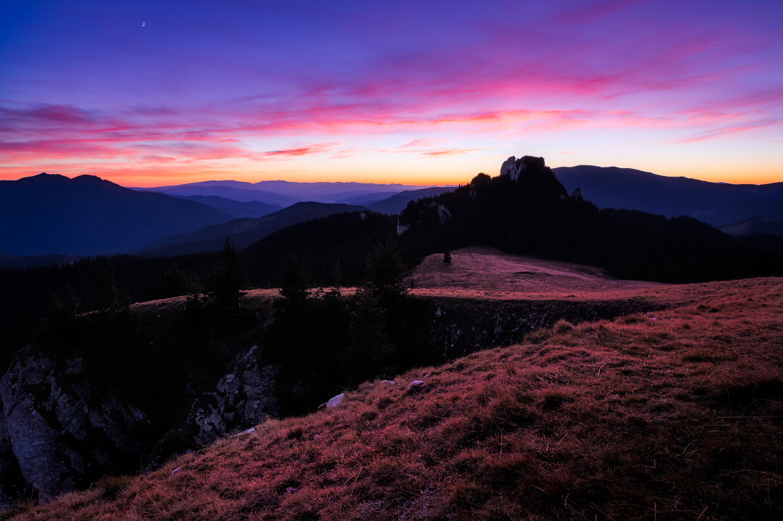 Imaginea realizata de fotograf reprezinta o vedere spre Pietrele Doamnei din Muntii Rarau, la apus, toamna.