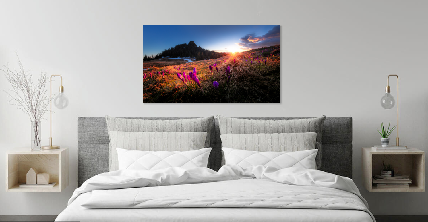 Imaginea realizata de fotograf surprinde brandusele din Muntii Rarau, cu Pietrele Doamnei in fundal, la apus, primavara.