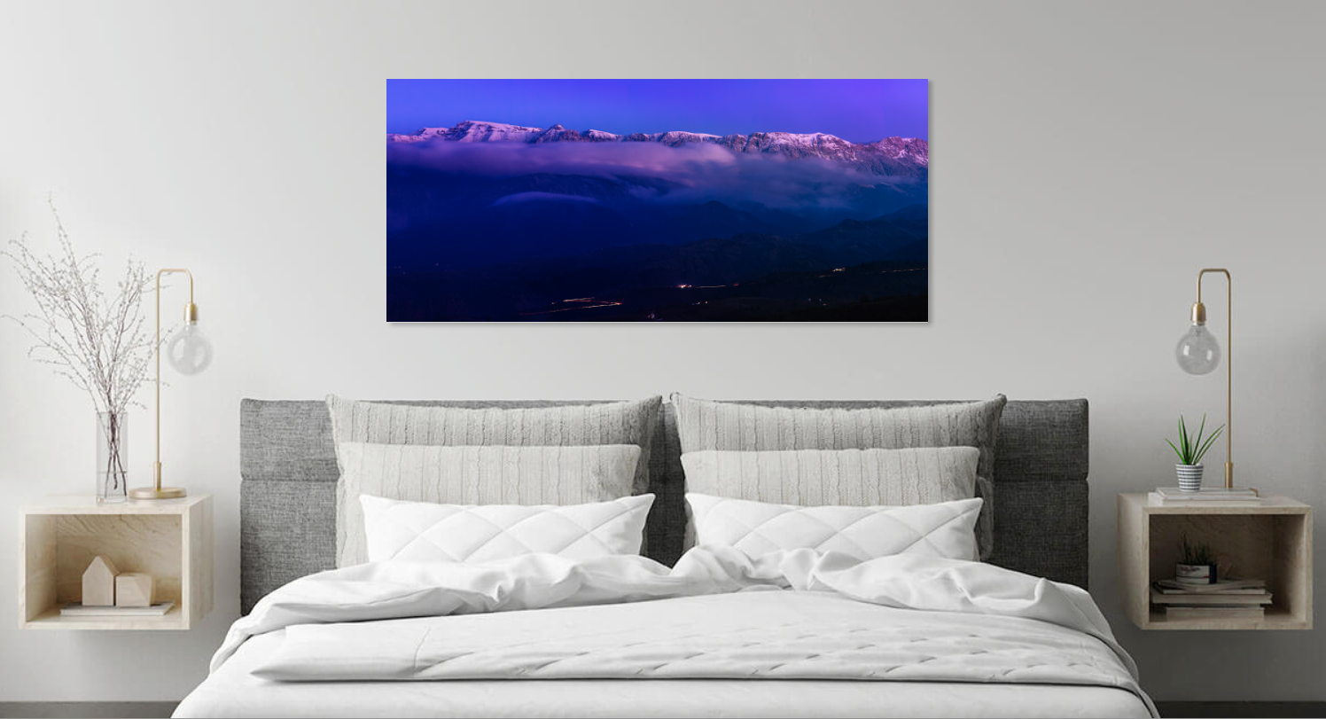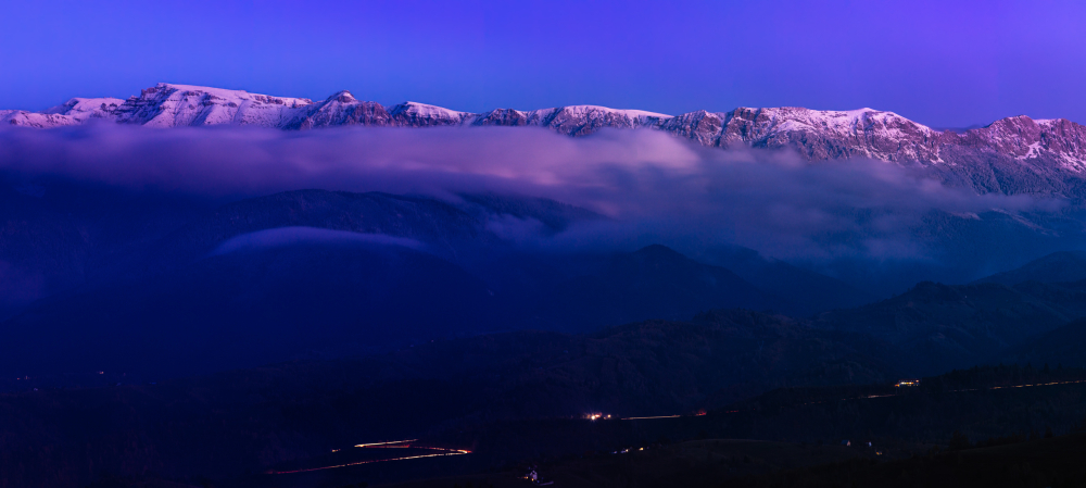 Imaginea realizata de fotograf surprinde Muntii Bucegi la ora albastra, vazuti din satul Pestera, judetul Brasov.